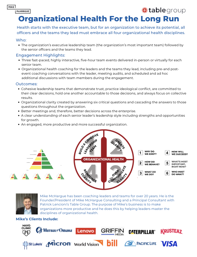 Health starts with the executive team, but for an organization to achieve its potential, the next-level leaders and their teams must embrace all four organizational health disciplines.
